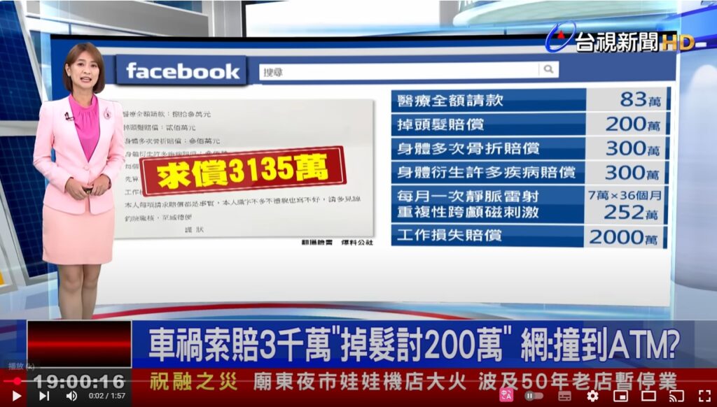 車禍索賠3千萬「掉髮討200萬」 網:撞到ATM?